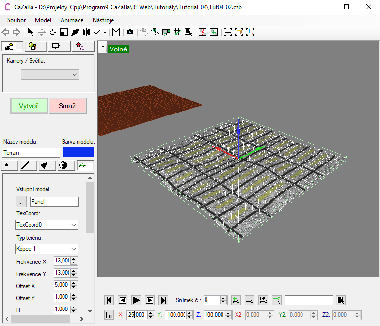 Po nastavení terénu vidíme, že se v prostoru objevil nový panel deformovaný podle výše zmíněných parametrů. Zatím je ale bez materiálu, a proto mu jeden nastavíme. Na panelu nástrojů tlačítkem Materiály