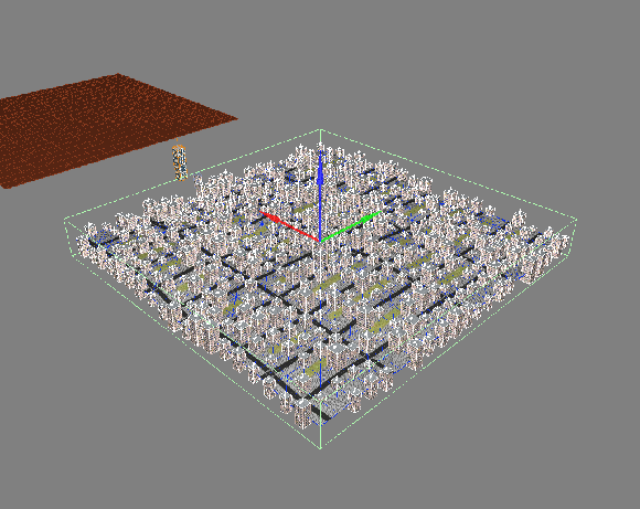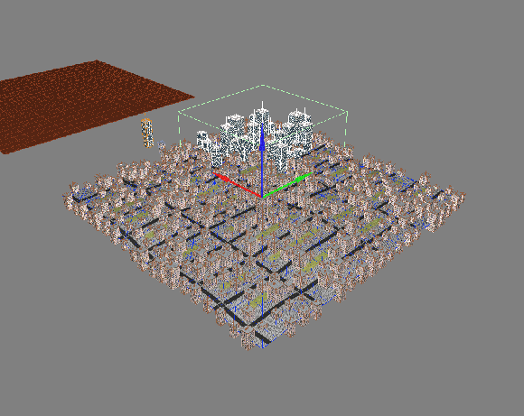 Jak vidno, funkce rozmístí 400 domů přičemž se budou lišit v umístění nad terénem až do výšky +/- 1 jednotka a ve velikosti až do +/- 50 procent. Dál také vidíme, že pokud měl model prvku přiřazené nějaké materiály, tak funkce Generovaná množina je automaticky převezme na sebe. Pozor: Generovaná množina je samostatný model. Aby byl správně umístěný na terénu, s jehož pomocí je Generovaná množina tvořená, musí být oba umístěny ve stejném bodě v prostoru.